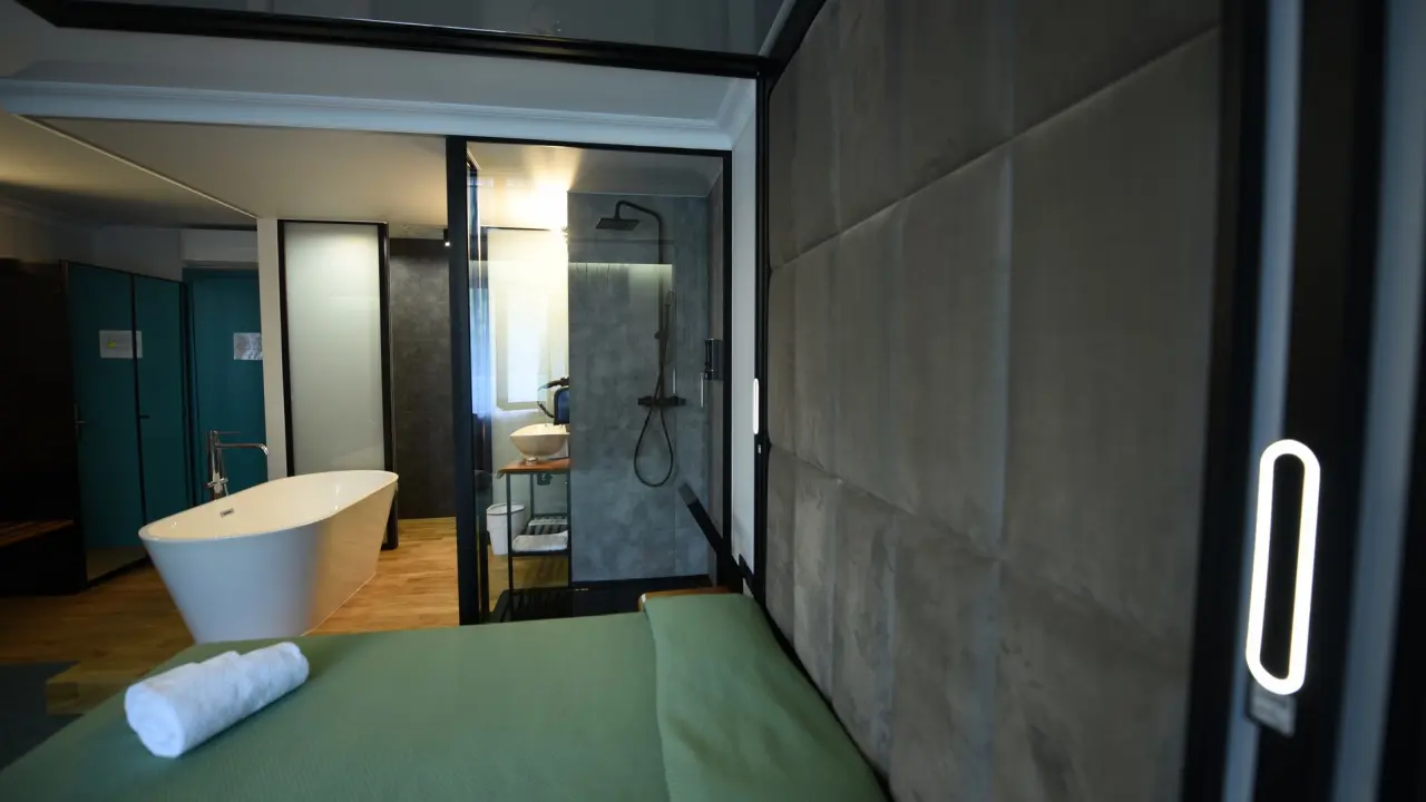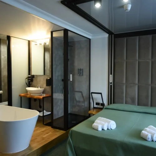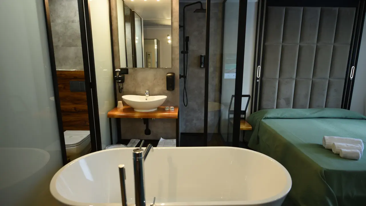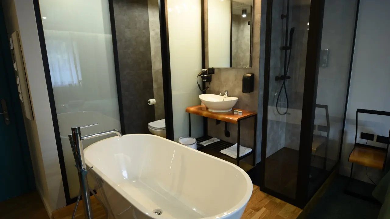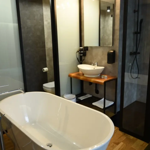 Pokój dwuosobowy obejmuje prywatną łazienkę wyposażoną w wannę, prysznic, bidet i suszarkę do włosów.