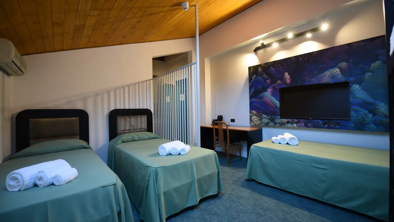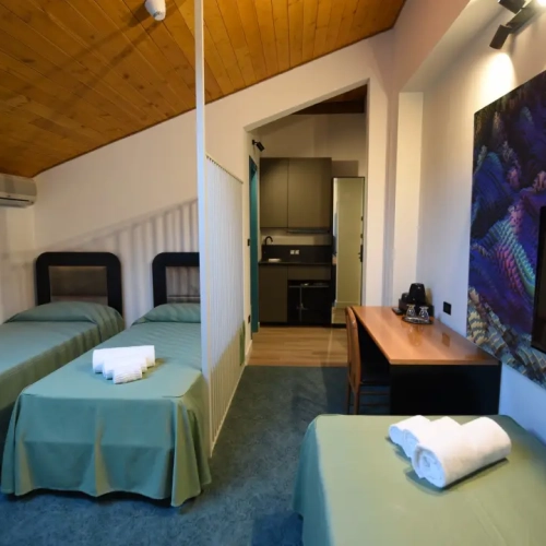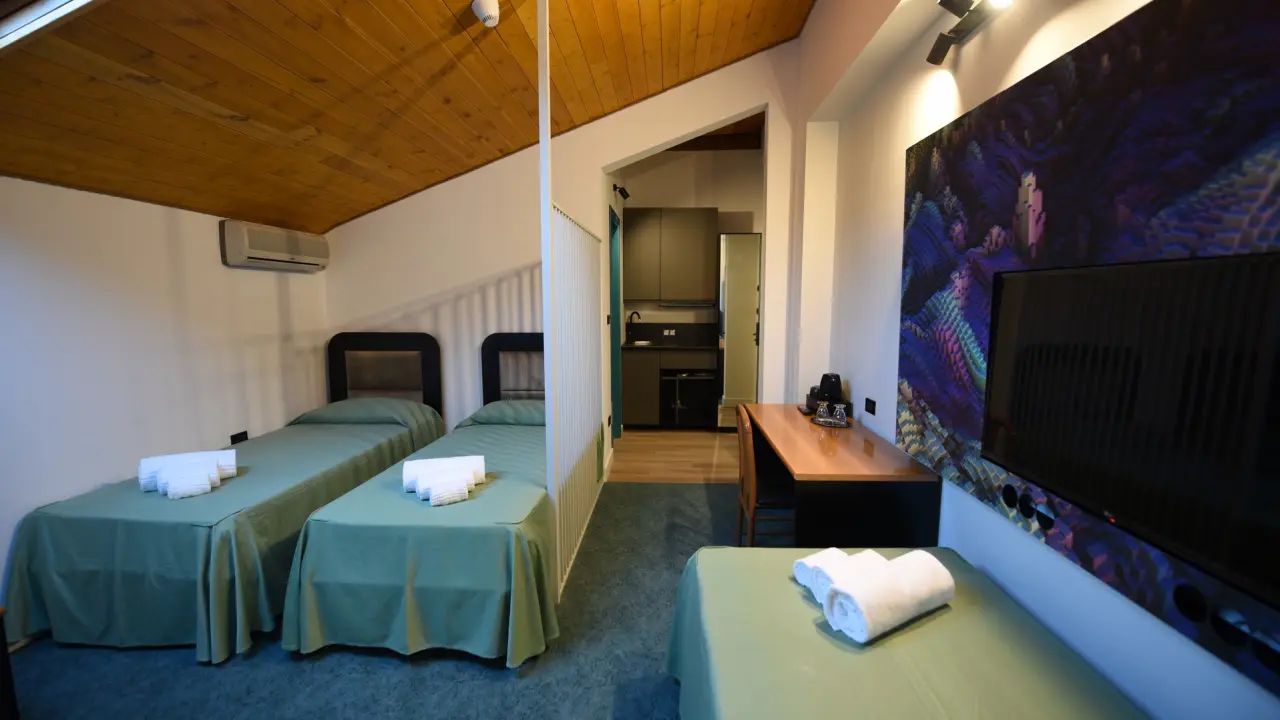W aneksie kuchennym goście znajdą płytę grzejną, lodówkę i naczynia kuchenne. Ten pokój rodzinny posiada klimatyzację, minibar, telewizor z płaskim ekranem i kanałami kablowymi, a także wino / szampana dla gości. Pokój posiada 4 łóżka